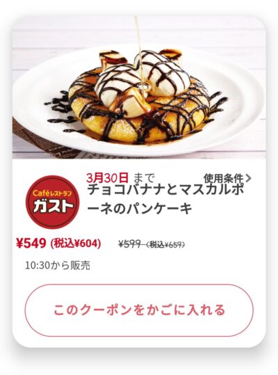 チョコバナナとマスカルポーネのパンケーキ55円引き Published 2022年3月24日 at 400 × 539 in 【2024年2月最新】ガストの割引クーポンコード・番号まとめ情報 チョコバナナとマスカルポーネのパンケーキ55円引き 広告 ← Previous Next →