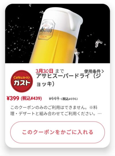 スーパードライジョッキ55円引き Published 2022年3月24日 at 400 × 539 in 【2024年2月最新】ガストの割引クーポンコード・番号まとめ情報 スーパードライジョッキ55円引き 広告 ← Previous Next →