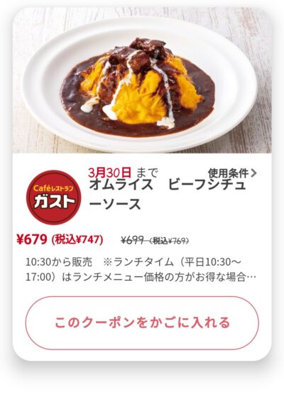 IMG_202オムライスビーフシチューソース22円引き20324_154726 Published 2022年3月24日 at 400 × 563 in 【2024年2月最新】ガストの割引クーポンコード・番号まとめ情報 オムライスビーフシチューソース22円引き 広告 ← Previous Next →