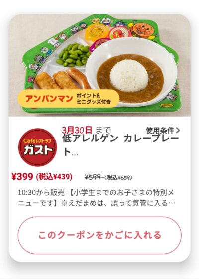 キッズ低アレルゲンカレープレート220円引き Published 2022年3月24日 at 400 × 560 in 【2024年2月最新】ガストの割引クーポンコード・番号まとめ情報 キッズ低アレルゲンカレープレート220円引き 広告 ← Previous Next →