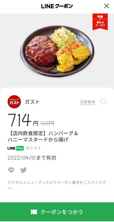 店内飲食限定ハンバーグ&ハニーマスタードから揚げ55円引き Published 2022年3月26日 at 400 × 779 in 【2024年2月最新】ガストの割引クーポンコード・番号まとめ情報 店内飲食限定ハンバーグ&ハニーマスタードから揚げ55円引き 広告 ← Previous Next →