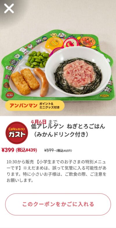 キッズ低アレルゲンねぎとろご飯セット220円引き Published 2022年3月31日 at 400 × 782 in 【2024年2月最新】ガストの割引クーポンコード・番号まとめ情報 キッズ低アレルゲンねぎとろご飯セット220円引き 広告 ← Previous Next →