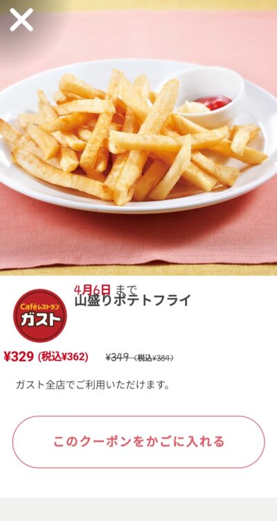 山盛りポテトフライ22円引き Published 2022年3月31日 at 400 × 751 in 【2024年2月最新】ガストの割引クーポンコード・番号まとめ情報 山盛りポテトフライ22円引き 広告 ← Previous Next →