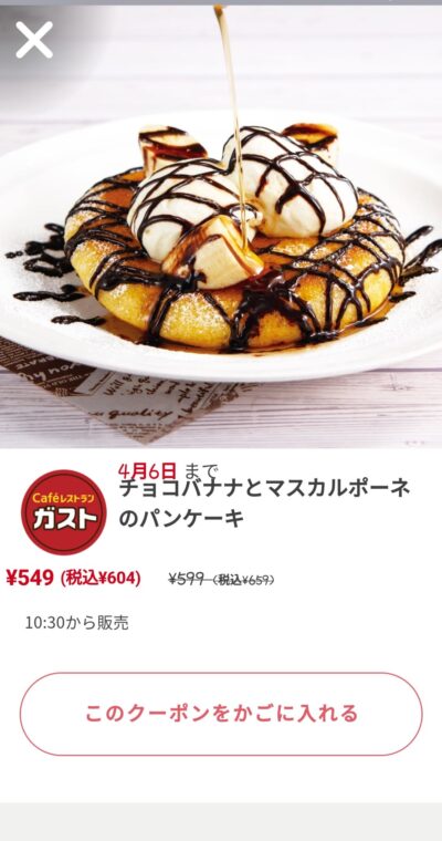 チョコバナナとマスカルポーネのパンケーキ55円引き Published 2022年3月31日 at 400 × 760 in 【2024年2月最新】ガストの割引クーポンコード・番号まとめ情報 チョコバナナとマスカルポーネのパンケーキ55円引き 広告 ← Previous Next →