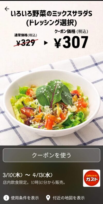 いろいろ野菜のミックスサラダS22円引き Published 2022年3月31日 at 400 × 790 in 【2024年2月最新】ガストの割引クーポンコード・番号まとめ情報 いろいろ野菜のミックスサラダS22円引き 広告 ← Previous Next →