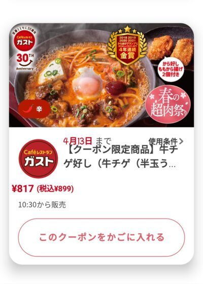 クーポン限定商品牛チゲ好し Published 2022年4月7日 at 400 × 560 in 【2024年2月最新】ガストの割引クーポンコード・番号まとめ情報 クーポン限定商品牛チゲ好し 広告 ← Previous Next →