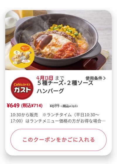 5種チーズ×2種ソースハンバーグ55円引き Published 2022年4月7日 at 400 × 560 in 【2024年2月最新】ガストの割引クーポンコード・番号まとめ情報 5種チーズ×2種ソースハンバーグ55円引き 広告 ← Previous Next →
