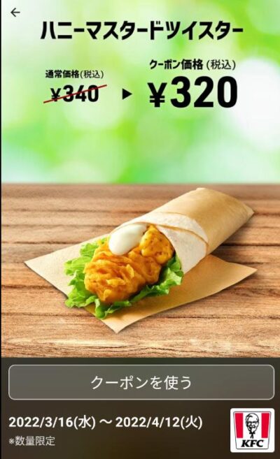 ハニーマスタードツイスター20円引き Published 2022年3月22日 at 400 × 657 in 【2024年2月最新】ケンタッキーの割引クーポン ハニーマスタードツイスター20円引き 広告 ← Previous Next →