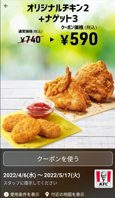 ケンタッキー2+ナゲット3 150円引き Published 2022年4月7日 at 400 × 687 in 【2024年2月最新】ケンタッキーの割引クーポン ケンタッキー2+ナゲット3 150円引き 広告 ← Previous Next →