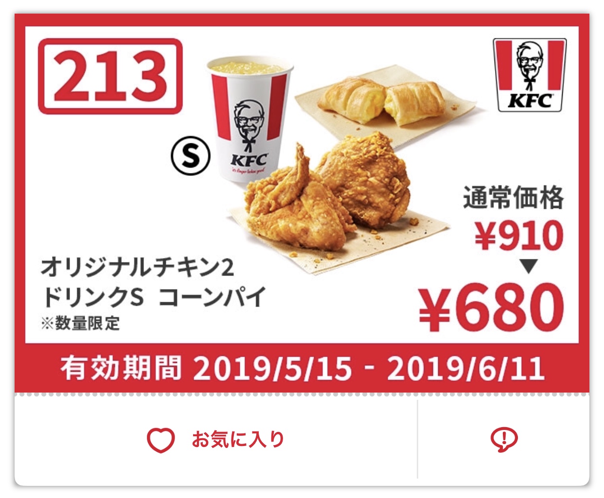 オリジナルチキン2、ドリンクS、コーンパイ¥680 Published 2019年5月16日 at 1242 × 1025 in 【2024年2月最新】ケンタッキーの割引クーポン 広告 ← Previous Next →