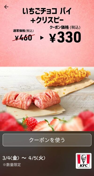 ケンタッキーいちごチョコパイ+クリスピー130円引き Published 2022年3月5日 at 400 × 749 in 【2024年2月最新】ケンタッキーの割引クーポン いちごチョコパイ+クリスピー130円引き 広告 ← Previous Next →