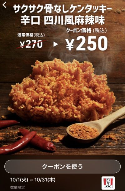ケンタッキー骨なし辛口麻辣味20円引きクーポン Published 2019年10月25日 at 400 × 613 in 【2024年2月最新】ケンタッキーの割引クーポン 骨なし辛口麻辣味20円引き 広告 ← Previous Next →