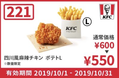 ケンタッキー麻辣チキン+ポテトL50円引きクーポン Published 2019年10月25日 at 400 × 263 in 【2024年2月最新】ケンタッキーの割引クーポン 麻辣チキン+ポテトL50円引き 広告 ← Previous Next →