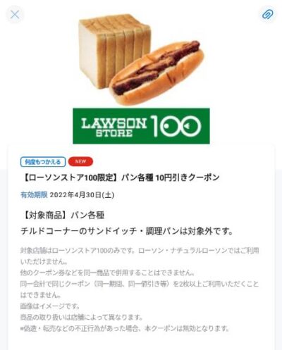 ローソンストア100 パン各種10円引き Published 2022年4月2日 at 400 × 497 in 【2024年2月最新】ローソンの割引クーポンまとめ情報 ローソンストア100 パン各種10円引き 広告 ← Previous Next →