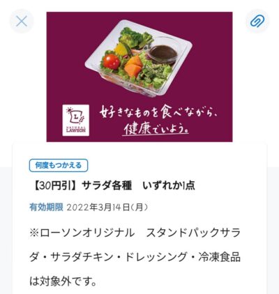 ローソン 対象のサラダ各種いずれか一点30円引き Published 2022年3月2日 at 400 × 422 in 【2024年2月最新】ローソンの割引クーポンまとめ情報 対象のサラダ各種いずれか一点30円引き 広告 ← Previous Next →