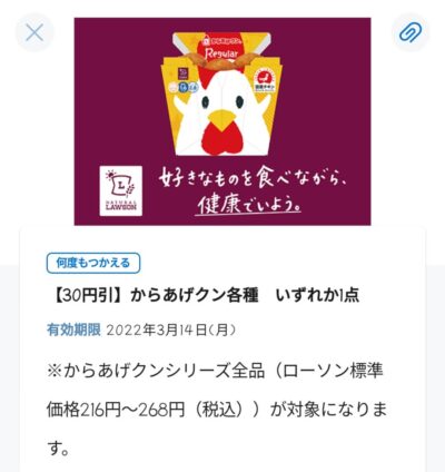 ローソン からあげくん各種 いずれか一点 30円引き Published 2022年3月2日 at 400 × 424 in 【2024年2月最新】ローソンの割引クーポンまとめ情報 からあげくん各種 いずれか一点 30円引き 広告 ← Previous Next →