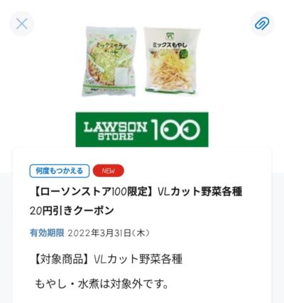 ローソンストア100 カット野菜各種20円引き Published 2022年3月2日 at 400 × 426 in 【2024年2月最新】ローソンの割引クーポンまとめ情報 ローソンストア100 カット野菜各種20円引き 広告 ← Previous Next →