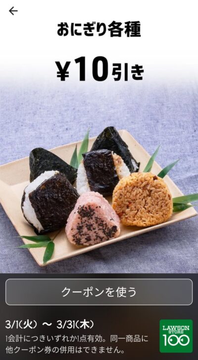 ローソンストア100 おにぎり各種10円引き Published 2022年3月2日 at 400 × 726 in 【2024年2月最新】ローソンの割引クーポンまとめ情報 おにぎり各種10円引き 広告 ← Previous Next →