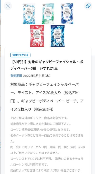 ローソンギャッツビーフェイシャル・ボディーペーパー 50円引き Published 2022年3月20日 at 400 × 731 in 【2024年2月最新】ローソンの割引クーポンまとめ情報 ギャッツビーフェイシャル・ボディーペーパー 50円引き 広告 ← Previous Next →