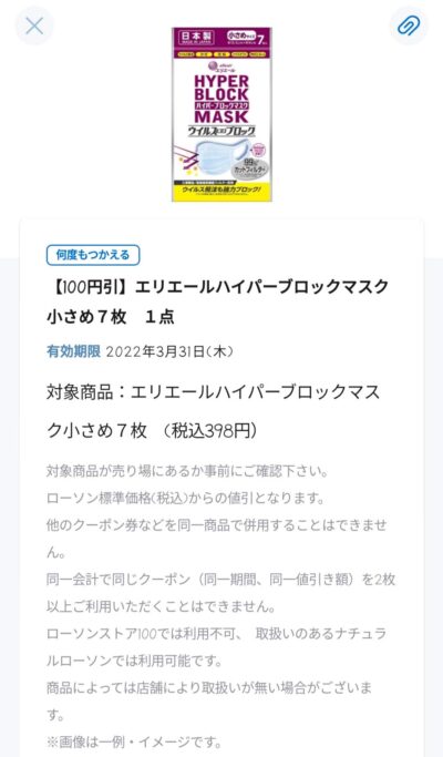 ローソンエリエール ハイパーブロックマスク小さめ7枚 100円引き Published 2022年3月20日 at 400 × 683 in 【2024年2月最新】ローソンの割引クーポンまとめ情報 ローソンエリエール ハイパーブロックマスク小さめ7枚 100円引き 広告 ← Previous Next →