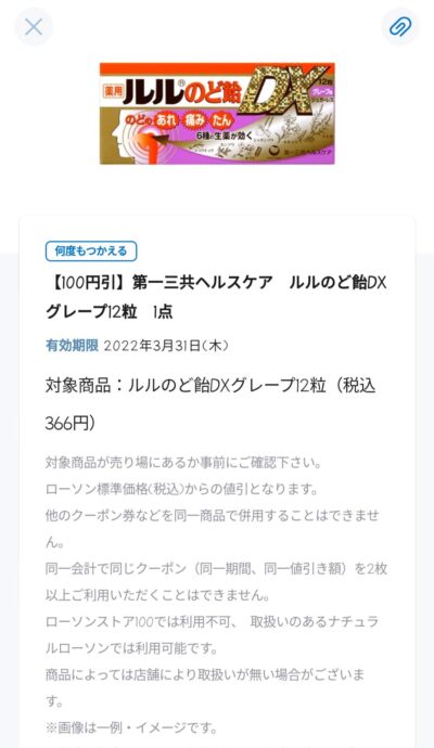 ローソン第一三共ヘルスケア ルルのど飴DXグレープ 100円引き Published 2022年3月20日 at 400 × 690 in 【2024年2月最新】ローソンの割引クーポンまとめ情報 第一三共ヘルスケア ルルのど飴DXグレープ100円引き 広告 ← Previous Next →
