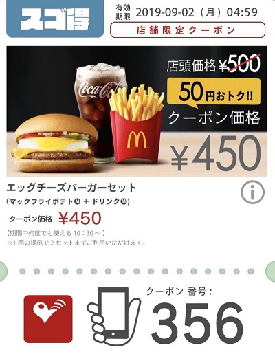 エッグチーズバーガーMセット50円引き Published 2019年8月20日 at 400 × 515 in 【2024年2月最新】マクドナルドの割引クーポンまとめ情報! エッグチーズバーガーMセット50円引き 広告 ← Previous Next →
