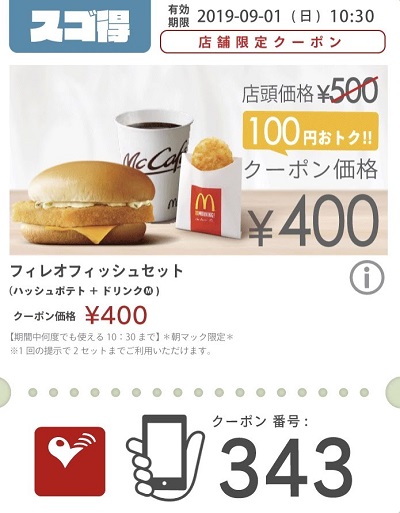 フィレオフィッシュMセット100円引き Published 2019年8月20日 at 400 × 513 in 【2024年2月最新】マクドナルドの割引クーポンまとめ情報! フィレオフィッシュMセット100円引き 広告 ← Previous Next →