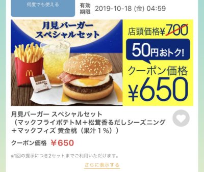 マクドナルドの月見バーガースペシャルセット50円引きクーポン Published 2019年10月12日 at 400 × 338 in 【2024年2月最新】マクドナルドの割引クーポンまとめ情報! 広告 ← Previous Next →