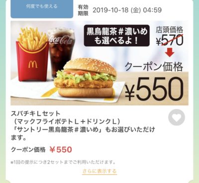 マクドナルドのスパチキLセット20円引きクーポン Published 2019年10月12日 at 400 × 368 in 【2024年2月最新】マクドナルドの割引クーポンまとめ情報! 広告 ← Previous Next →