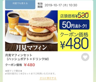 マクドナルドの月見マフィンセット50円引きクーポン Published 2019年10月12日 at 400 × 341 in 【2024年2月最新】マクドナルドの割引クーポンまとめ情報! 広告 ← Previous Next →