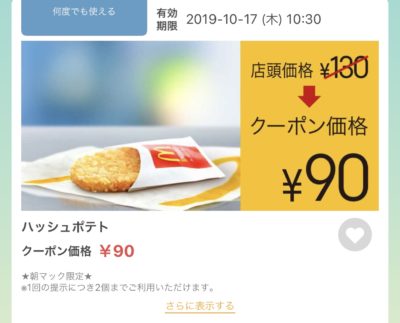 マクドナルドのハッシュポテト40円引きクーポン Published 2019年10月12日 at 400 × 323 in 【2024年2月最新】マクドナルドの割引クーポンまとめ情報! 広告 ← Previous Next →