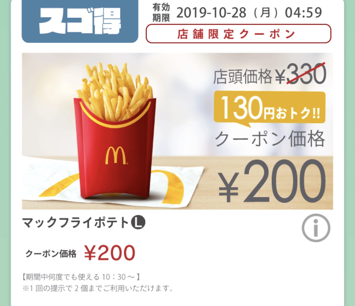 マクドナルドのマックフライポテトL130円引きクーポンIMG_6600 Published 2019年10月17日 at 1242 × 1072 in 【2024年2月最新】マクドナルドの割引クーポンまとめ情報! 広告 ← Previous Next →