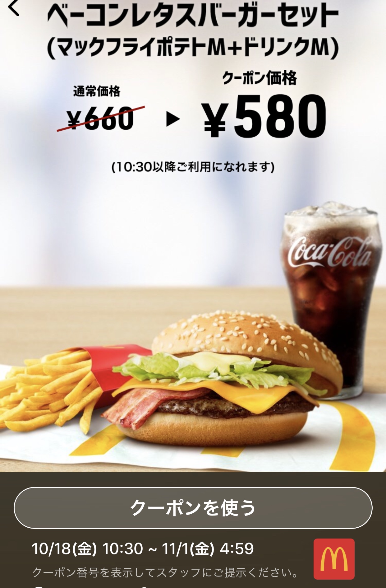 マクドナルドのベーコンレタスバーガーセット80円引きクーポン Published 2019年10月19日 at 1242 × 1890 in 【2024年2月最新】マクドナルドの割引クーポンまとめ情報! 広告 ← Previous Next →