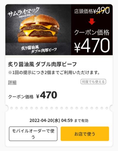 炙り醤油風ダブル肉厚ビーフ20円引き Published 2022年4月16日 at 400 × 511 in 【2024年2月最新】マクドナルドの割引クーポンまとめ情報! 炙り醤油風ダブル肉厚ビーフ20円引き 広告 ← Previous Next →