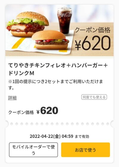 てりやきチキンフィレオ∔ハンバーガー∔ドリンクMクーポン Published 2022年4月16日 at 400 × 559 in 【2024年2月最新】マクドナルドの割引クーポンまとめ情報! てりやきチキンフィレオ∔ハンバーガー∔ドリンクMクーポン 広告 ← Previous Next →