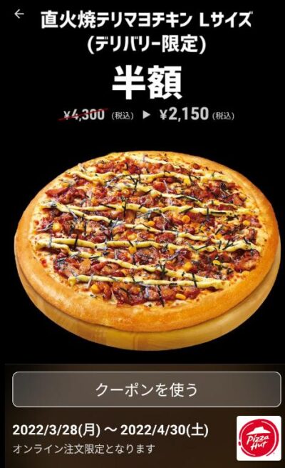 オンライン&デリバリー限定直火焼テリヤキチキンマヨLサイズ半額 Published 2022年3月29日 at 400 × 655 in 【2024年2月最新】ピザハットの割引クーポンコードまとめ情報 オンライン&デリバリー限定直火焼テリヤキチキンマヨLサイズ半額 広告 ← Previous Next →