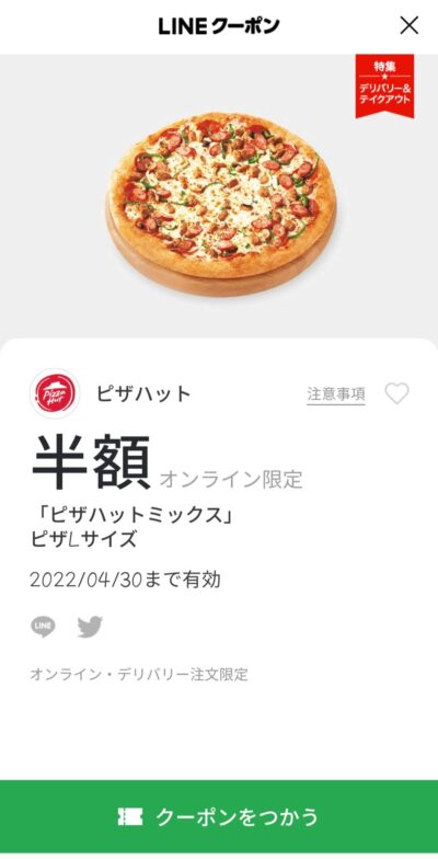 オンライン注文・デリバリー限定「ピザハットミックス」ピザLサイズ半額 Published 2022年3月29日 at 400 × 784 in 【2024年2月最新】ピザハットの割引クーポンコードまとめ情報 オンライン注文・デリバリー限定「ピザハットミックス」ピザLサイズ半額 広告 ← Previous Next →