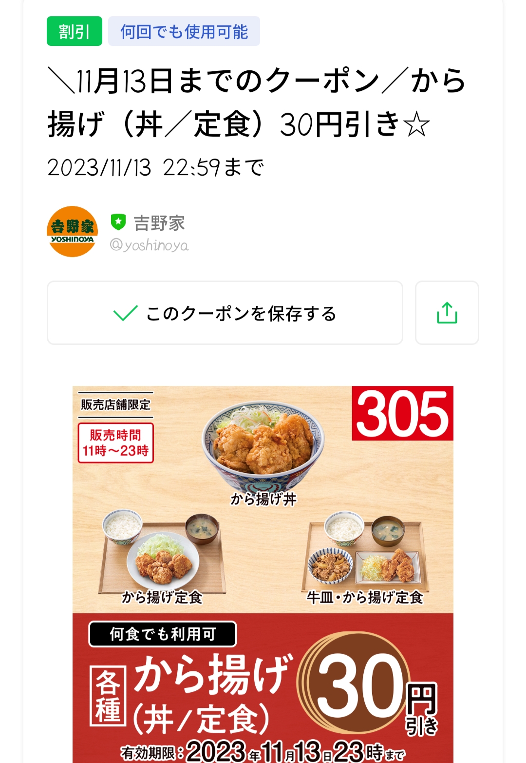 IMG_20231111_204203 Published 2023年11月12日 at 1080 × 1564 in 【2024年2月最新】吉野家の割引クーポンまとめ情報 広告 ← Previous Next →